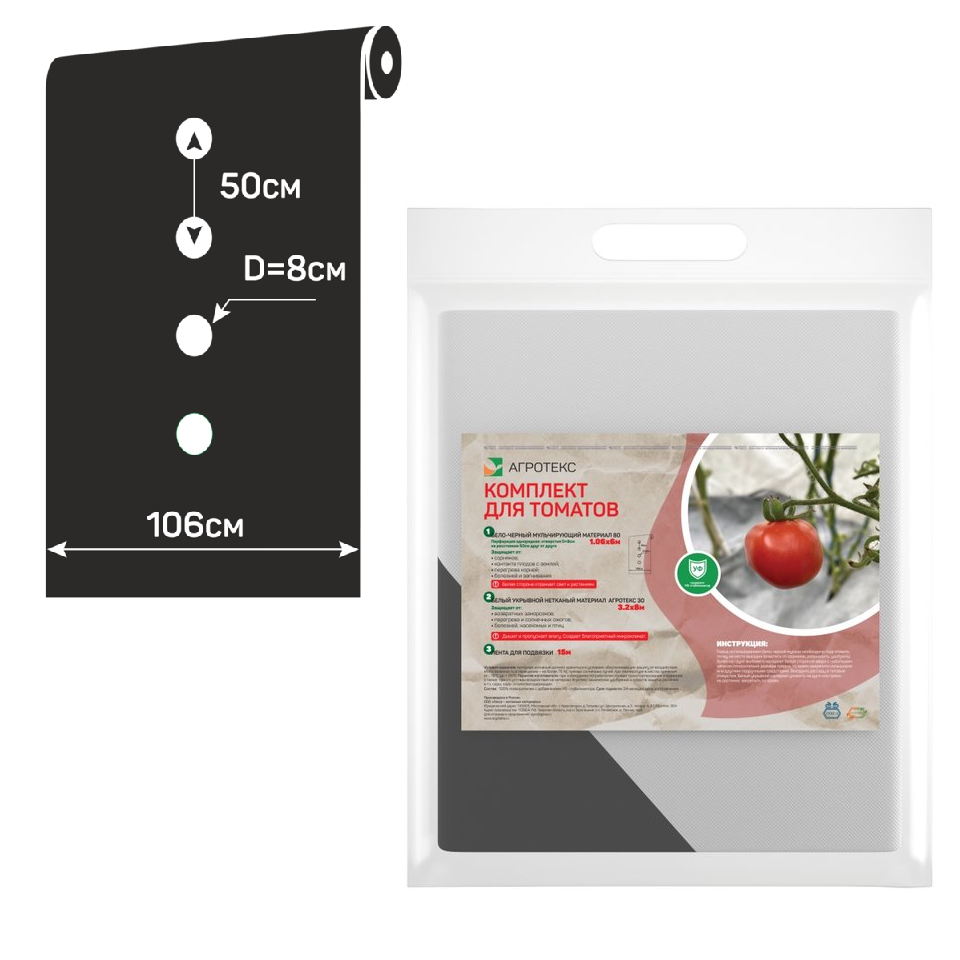 Мульчирующий материал (80 г/м²) 1.06х6 м, укрывной материал (30г/м²) 3.2х8 м, ленты для подвязки 15