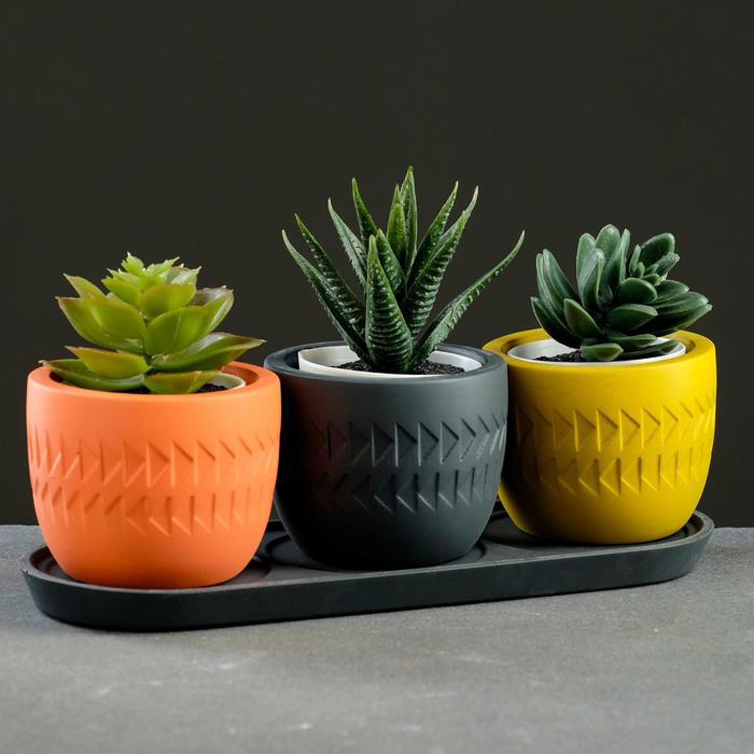 Кашпо гипсовое "Этно" НАБОР 3х0,18л с поддоном Лосось, Оливка, Антрацитк ("VipSet") *2