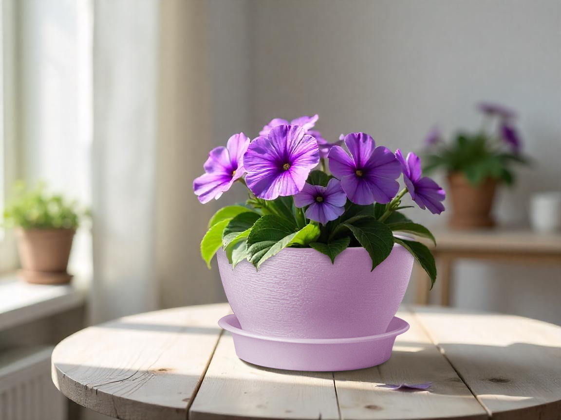 Кашпо пластм. "Фиалочка" 0,8л d верха 140мм h80мм с поддоном Сиренивый перламутр. КФ 0,8ПР *1/65