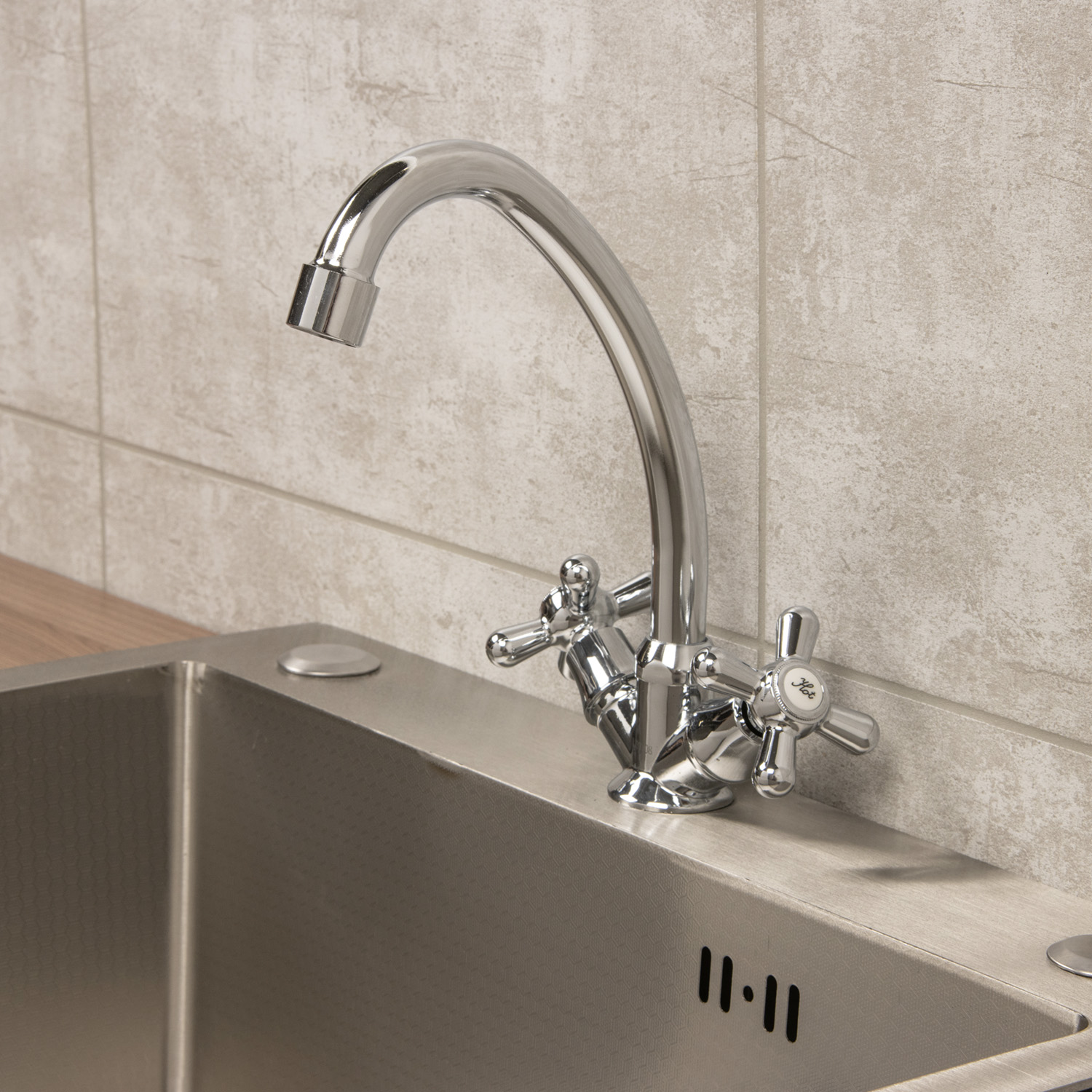 Двухзахватный смеситель RP021A для кухни с крестообразными пластиковыми маховиками типа «P» и вертикальным трубчатым изливом. Кран-буксы латунные с металлокерамическими запорными пластинами. Крепление к столешнице или мойке осуществляется с помощью шпильки, фигурной скобы и прокладок.