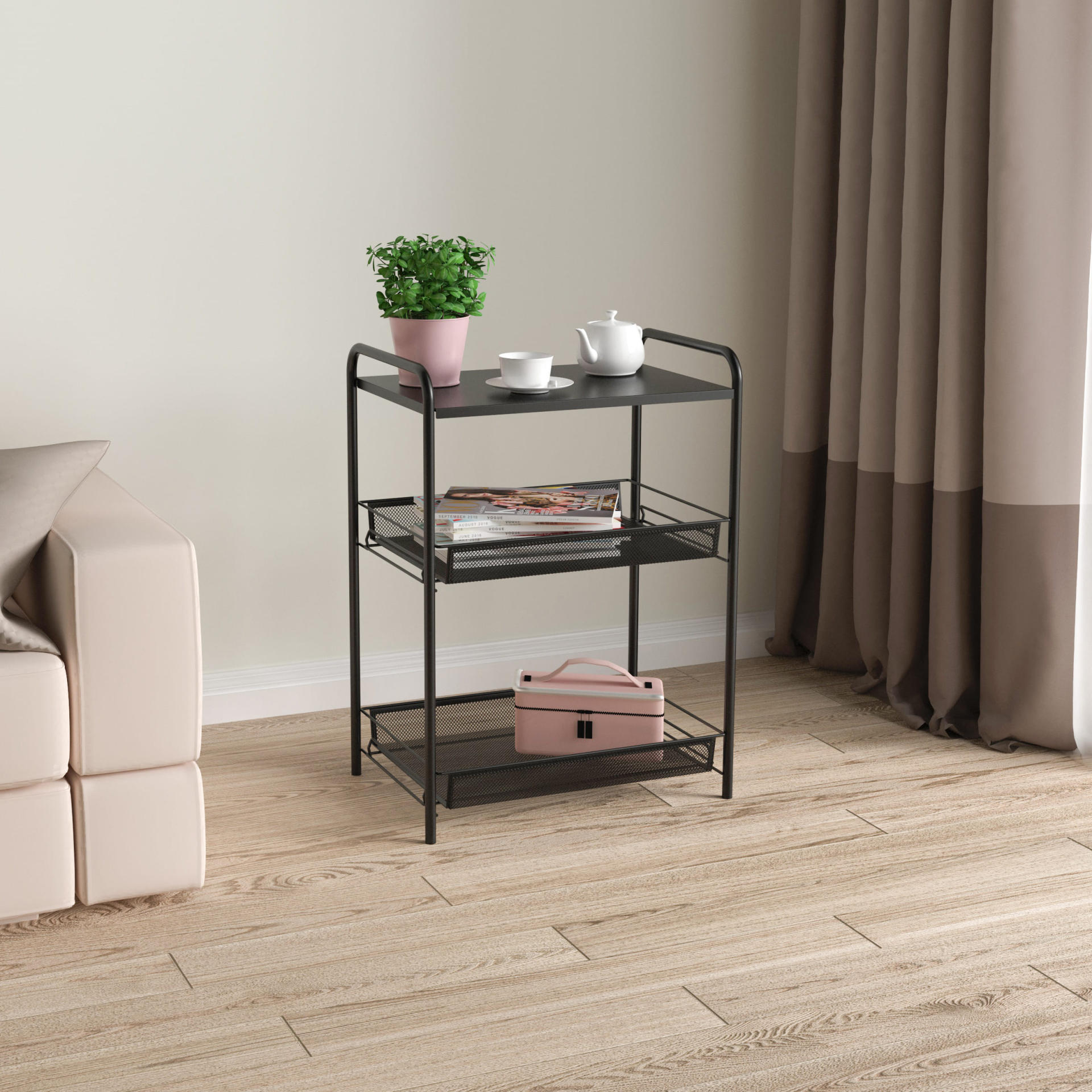 яяяЭтажерка металл. "Ладья33С" 3-х ур.-2 корз.+Полка 610х450х300мм, полим.покр.Черн. Э557Ч *1