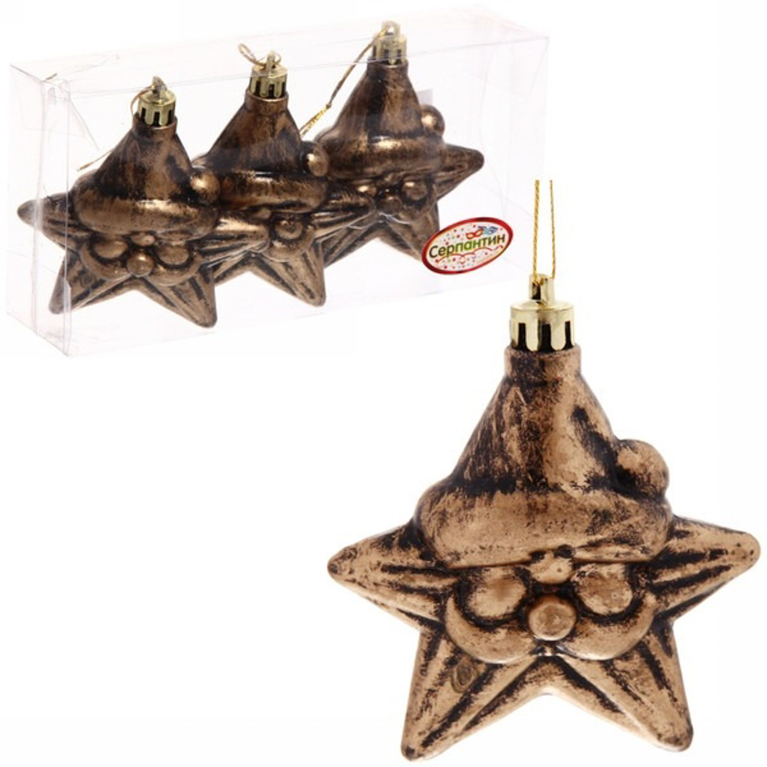 яяяЁлочная игрушка, набор 3шт, 8см "Звездочка Дед Мороз", бронза