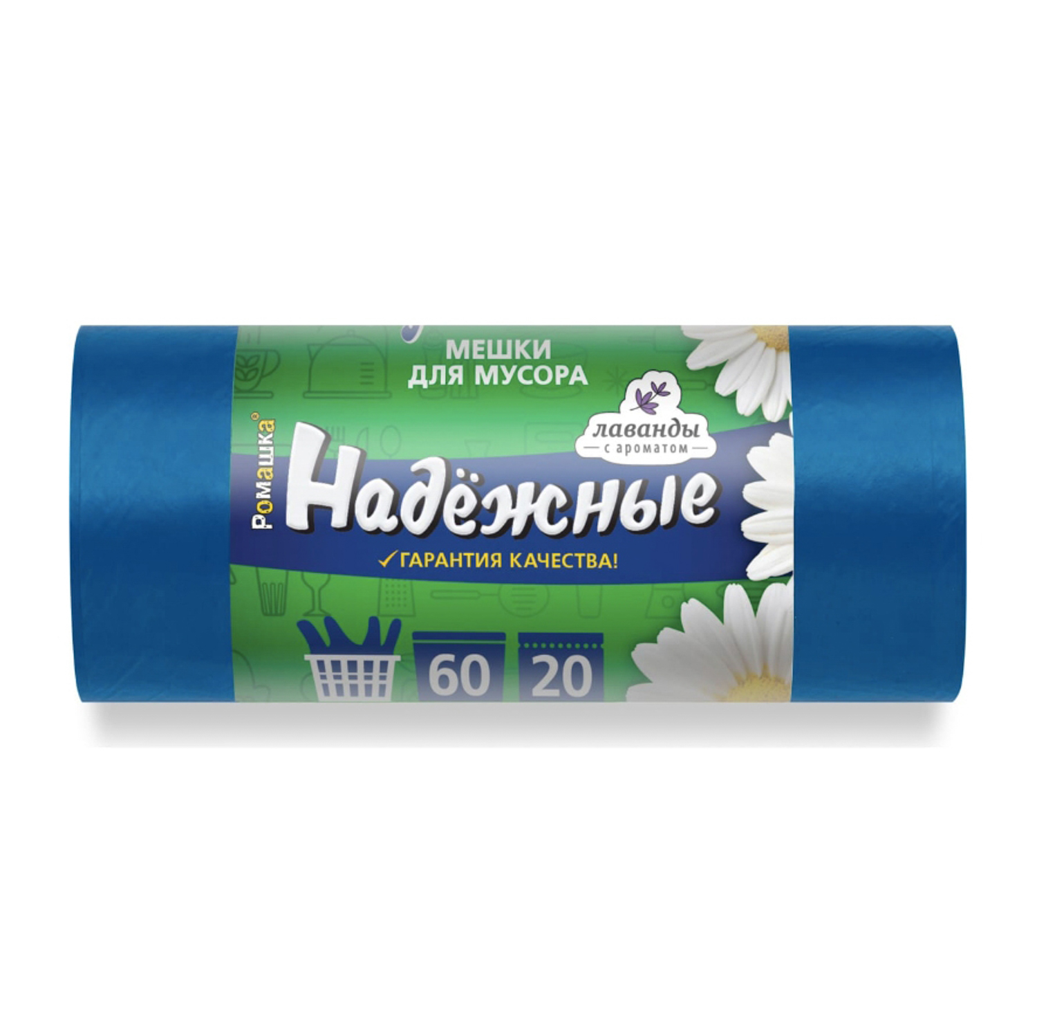 Мешки для мусора с "ушками" 60л*20шт толщ.15мкм "Надежные" Синий арт.ВЛ06420У "Ромашка" *20
