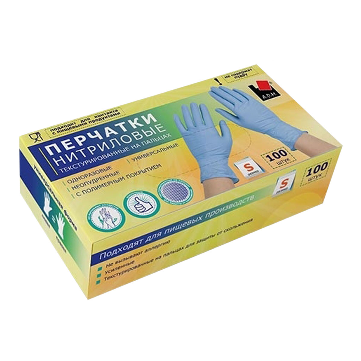 Перчатки нитриловые Усиленные, текстур. на пальцах S (малый) 100шт Голубые SEMP001K "А.Д.М." *1/10