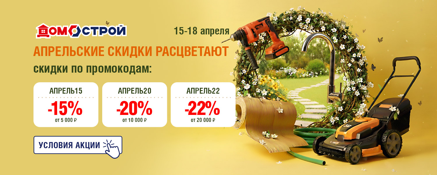 Скидка распространяется только на товары с белыми ценниками и с шильдиком «АПРЕЛЬ», не распространяется на товары с желтыми ценниками, на гр. Строительные материалы. Не суммируется с другими акциями (в том числе со скидкой по дисконтной карте, скидкой для пенсионеров и акцией для новоселов). При применении промокода списание бонусов станет недоступным. Подробности акции можно узнать у продавцов-консультантов, операторов интернет-магазина или по телефону горячей линии. Оплатить покупку акционных товаров бонусами в дни акции нельзя, но бонусы за покупки будут начисляться. Акция действует только для физических лиц.
