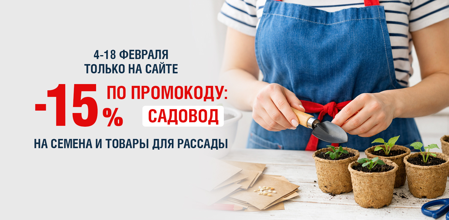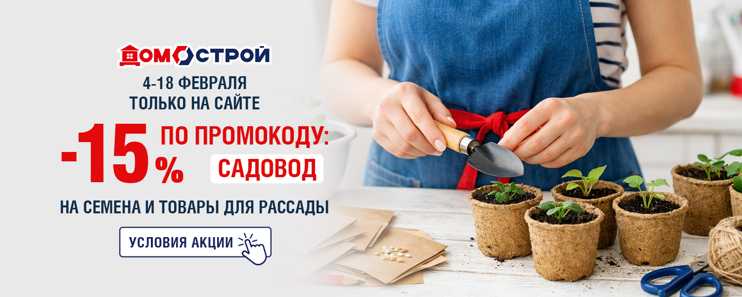 В сети ДомоСтрой с 4 по 18 февраля — скидка -15% на товары для рассады по промокоду САДОВОД. Товары для рассады, семена, почвогрунты и многое другое со скидкой — это отличный шанс начать сезон выгодно!